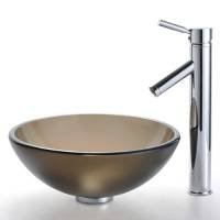 C-GV-103FR-14-12mm-1002AB Faucet Finish: Antique Bronze Faucet shown in chrome Features: -Glass vessel sink and sheven faucet. -Frosted Brown collection. -Faucet available in: -Chrome finish. -Satin nickel finish. -Antique bronze finish. -Oil rubbed bronze finish. . -Sink construction material: Solid tempered glass. -Faucet Construction Material: Solid brass. -Vessel mount. -Sink features polished glass interior and frosted exterior. -High-quality ceramic cartridge ensures year after year of trouble-free service. -Designed for above counter installation with standard US plumbing connections. -Mounting ring adds 0.5 inch. -Hole size for sink required: 1.75''. -Single hole faucet installation. -Lever handle. -Assembly required. -Includes all mounting hardware and hot/cold waterlines. -Solid brass mounting ring in matching finish included. -Solid brass umbrella pop-up drain in matching finish included. -All Kraus glass lavatory sinks are certified and listed by UPC, cUPC, CSA, IAPMO, ANSI and SCC. Specifications: -Kraus provides lifetime warranty and 5 year warranty for faucet. -ADA Compliant. -Faucet dimension: 13.75'' H x 1.9'' W x 1.9'' D. -Glass thickness: 0.5''. -Overall dimensions: 5.5'' H x 14'' D. For more information on this product please view the Sheet(s) below: Product Manual Specification Sheet Read more...