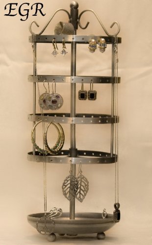 The Last Earring Organizer You Will Need! Earring-Go-Round is the perfect holder for earring and jewelry organization. The capabilities of this revolving, unique design are endless. The scrolls are designed to allow storage of necklaces, rings, bangles and other jewelry items. EGR is made of lead free, metal, electroplated antique pewter (muted silver). It holds at least 45 pair of earrings, more if you put 2 wires in 1 hole or randomly drape earrings over tiers. A small EGR stands approximately 12" high, 6" (across) in diameter (the dish/base is slightly larger in than the rotating basket for stability and access), is authentically embossed (EGR) on the storage dish/base with pre applied felt furniture protection pads. Shipping to US destinations will be USPS ground and 1st Class Int'l for other destinations. Read more...